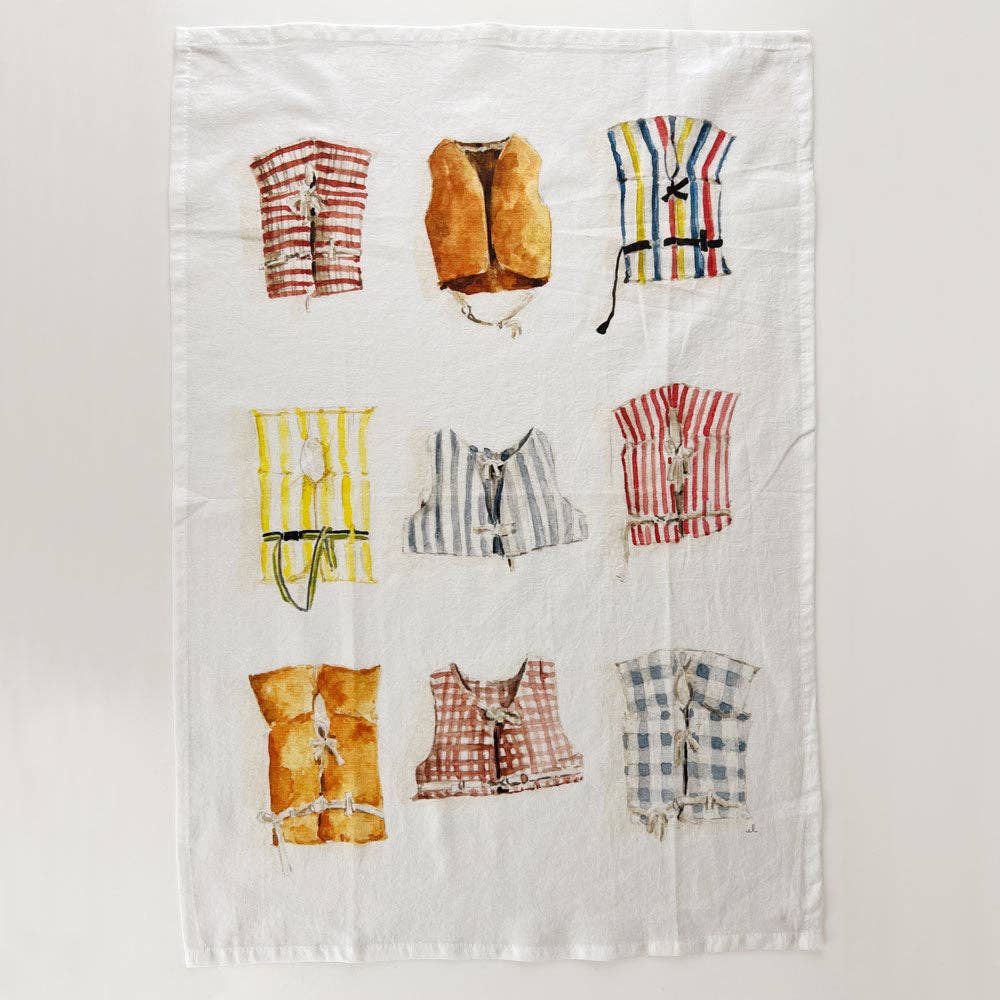 Bring a splash of seaside charm into your kitchen with this 100% cotton flour sack tea towel, featuring nine hand-painted “boat coats” — our favorite name for vintage life jackets. Each one feels like a love letter to long summer days, dockside laughter, and the kind of memories that smell faintly of saltwater and sunscreen.